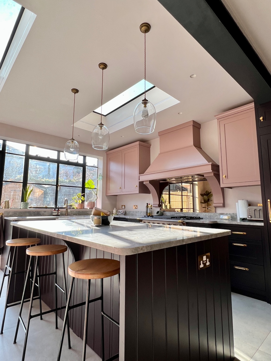 Kitchen with near-black lower cabinets, dusty pink uppers, quartzite island, and skylights — Walthamstow whole-house renovation